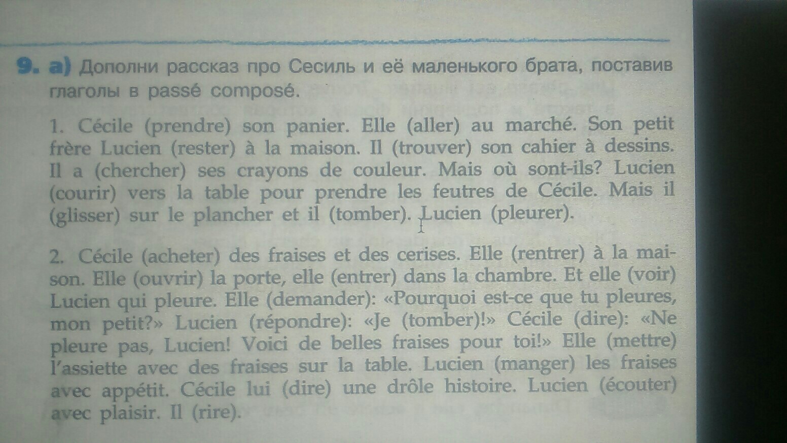 2) Cécile a acheté des fraises et des cerises. Elle est rentrée à la maison. Elle a ouvert la porte, elle est entrée dans la chambre. Et elle a vu Lucien qui pleurait. Elle a demandé pourquoi est-ce qu'il pleurait. Lucien a répondu qu'il est tombé. Cécile a dit ne pleure pas Lucien. Voici de belles fraises pour toi. Elle a mis l'assiette avec des fraises sur la table. Lucien a mangé les fraises avec appétit. Cécile lui a dit une drôle histoire. Lucien a écouté avec plaisir. Et il a rit.