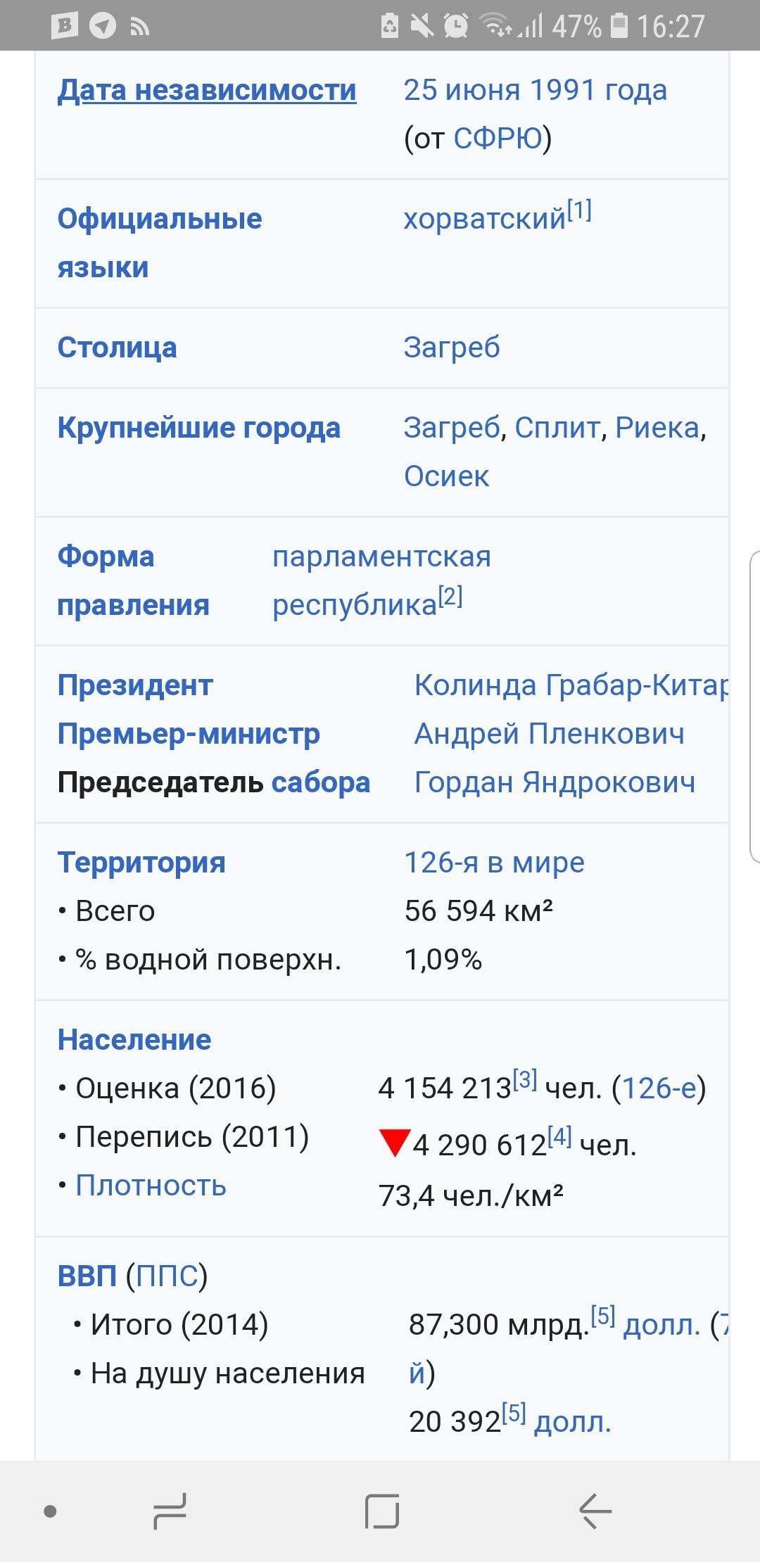 Хорва́тия (хорв. Hrvatska), официально Респу́блика Хорва́тия (хорв. Republika Hrvatska [xř̩ʋaːtskaː]) — государство на юге Центральной Европы, частично на западе Балканского полуострова, бывшая союзная республика в составе Югославии, ставшая независимой в 1991 году. Население, по данным на 31 декабря 2016 года, составляет 4 154 213 человек, территория — 56 594 км². Занимает 126-е место в мире по численности населения и 126-е по территории.
