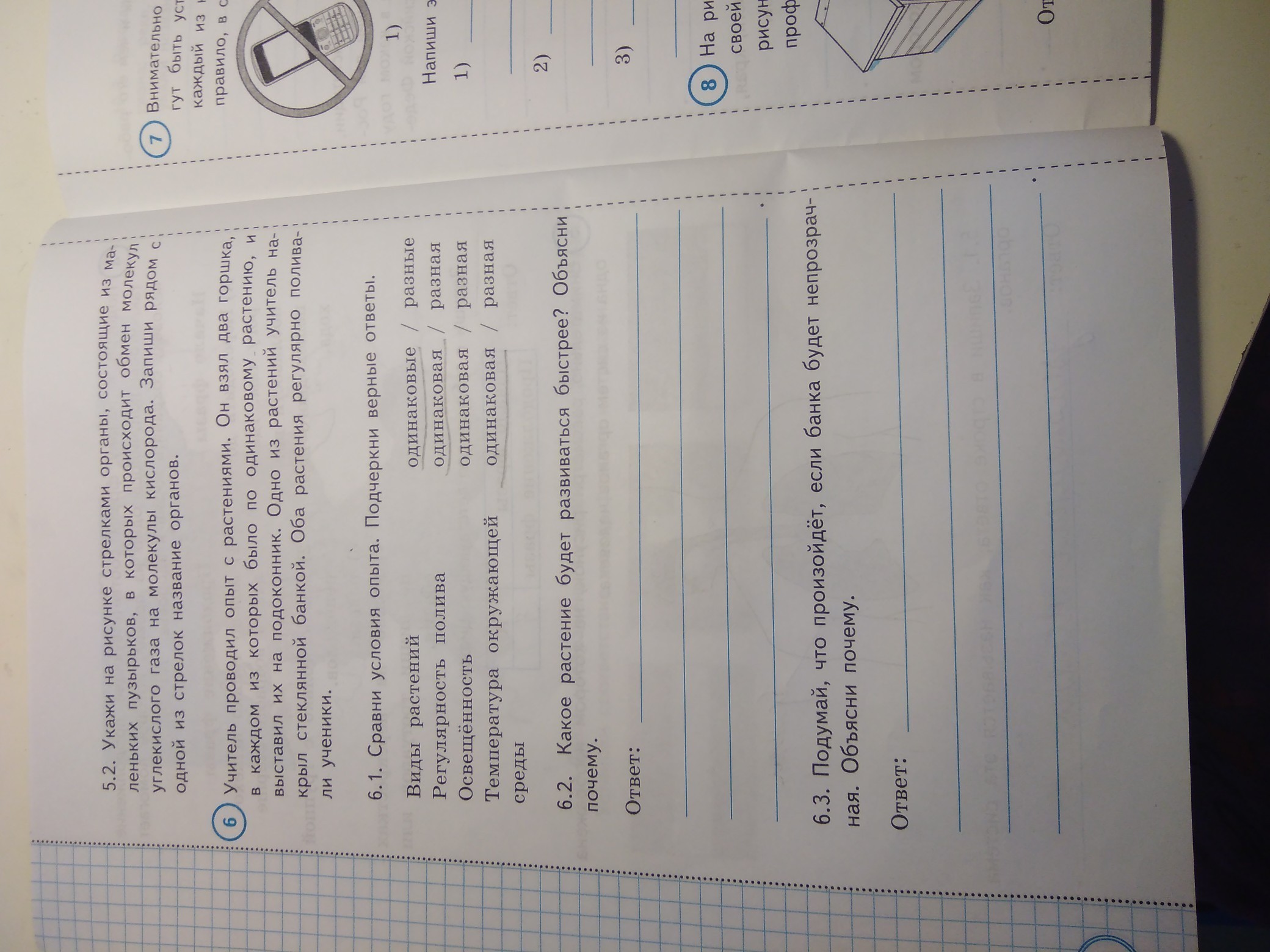 6.2 развиватся быстрее будет то растение которое не покрыто банк ой потому что к нему поступает больше воздуха