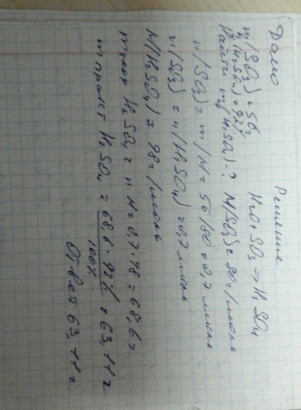 Вычислить массу серной кислоты, если для ее получения взяли 56 гр оксида серы (VI). ВЫход продукта составляет 92 %