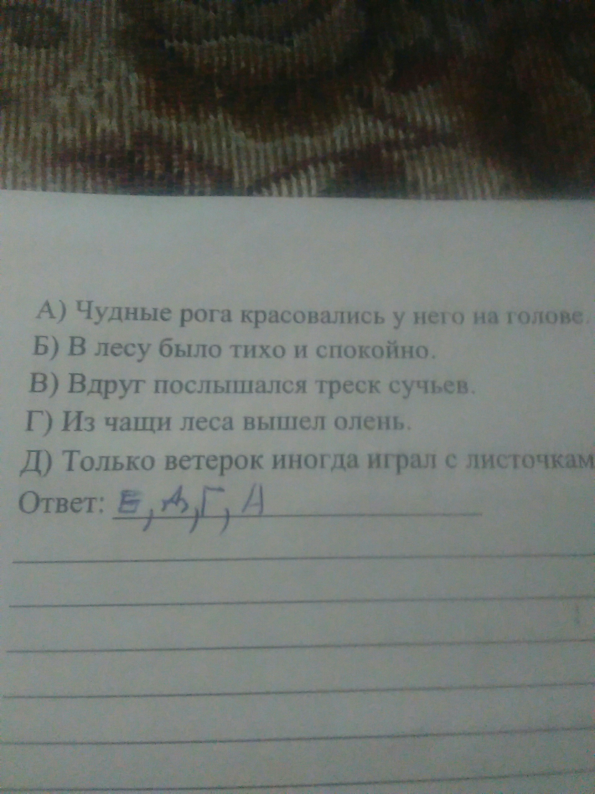 В лесу было тихо и спокойно. Только ветерок иногда играл с листочками. Вдруг послышался треск сучьев. Из чащи леса вышел олень. Чудные рога красовались у него на голове.