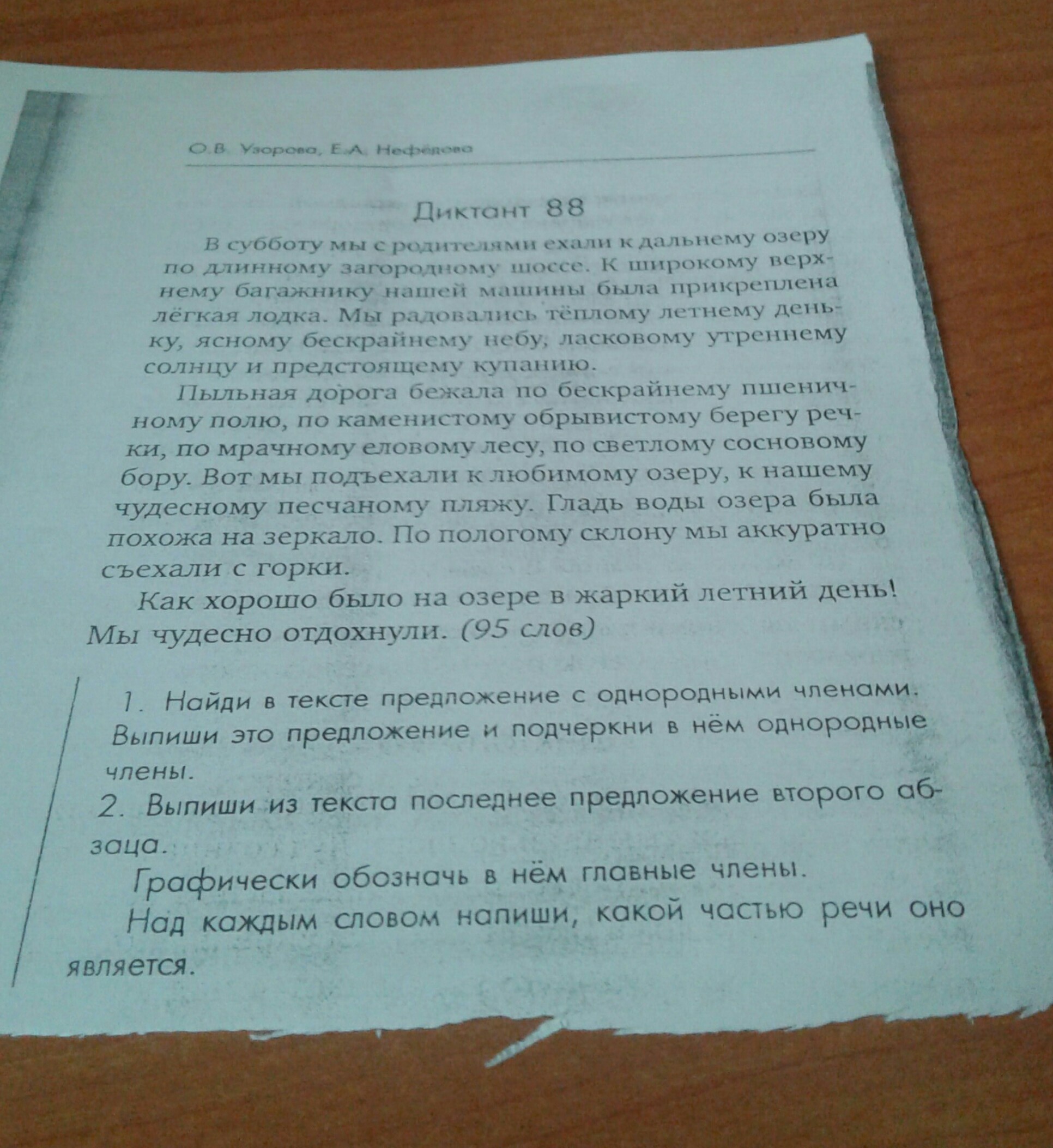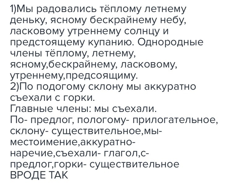 1)Мы радовались тёплому летнему деньку, ясному бескрайнему небу, ласковому утреннему солнцу и предстоящему купанию. Однородные члены тёплому, летнему, ясному,бескрайнему, ласковому, утреннему,предсоящиму.