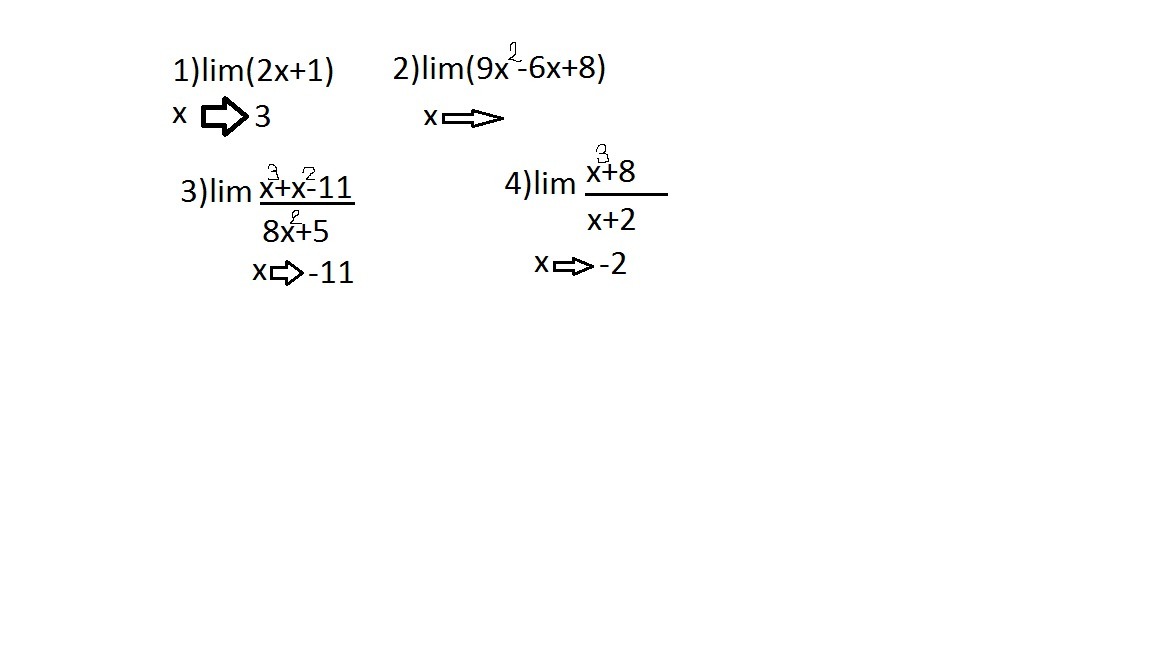 4)подставяем х, считаем : 2^{3}+8 / -2+2 = 64/0 => lim = бесконечность.
