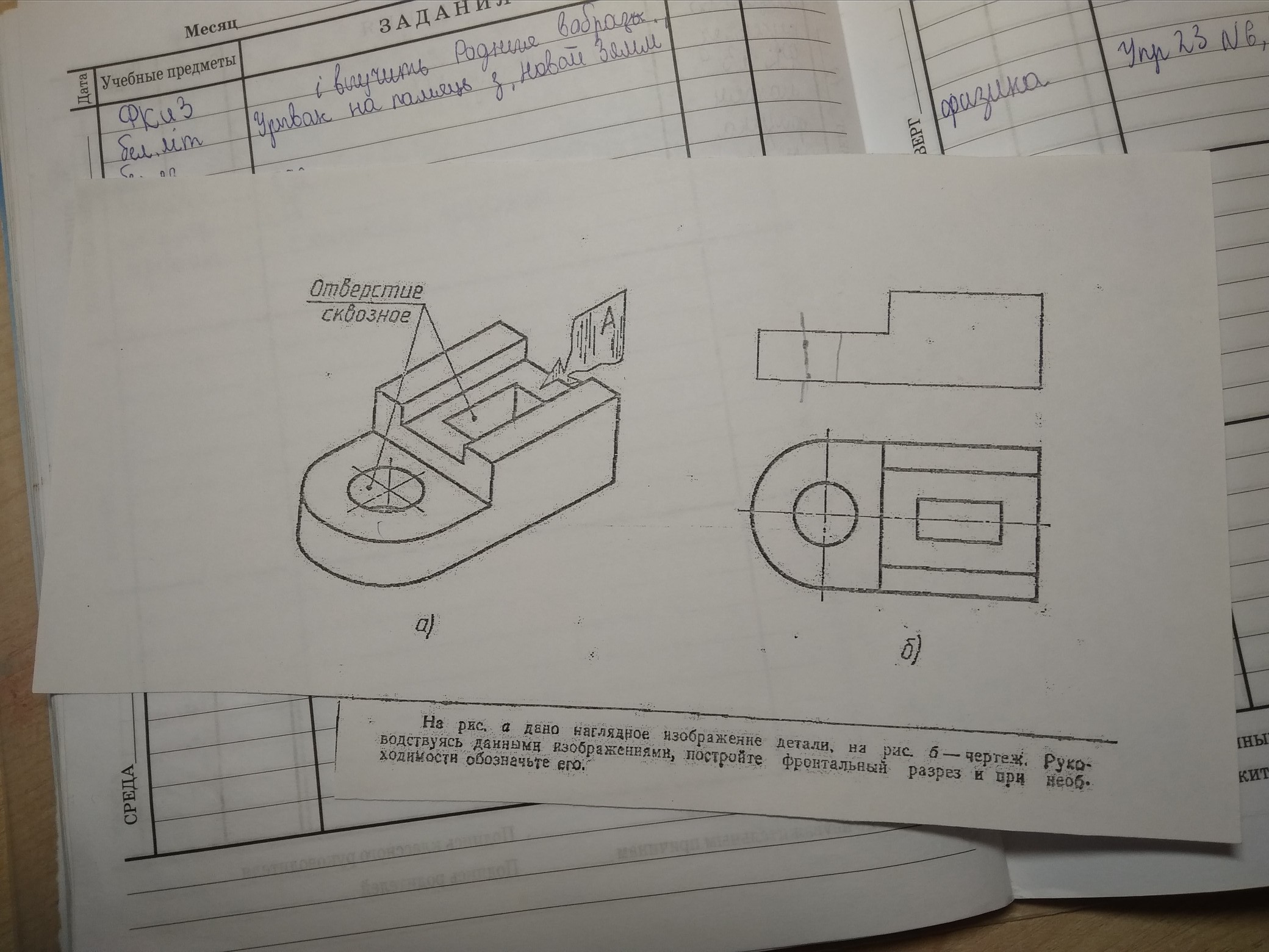 На рисунке наглядное изображение детали. На рис. б-чертёж. Руководствуясь данным изображениями, постройте фронтальный разрез и при необходимости обозначте его