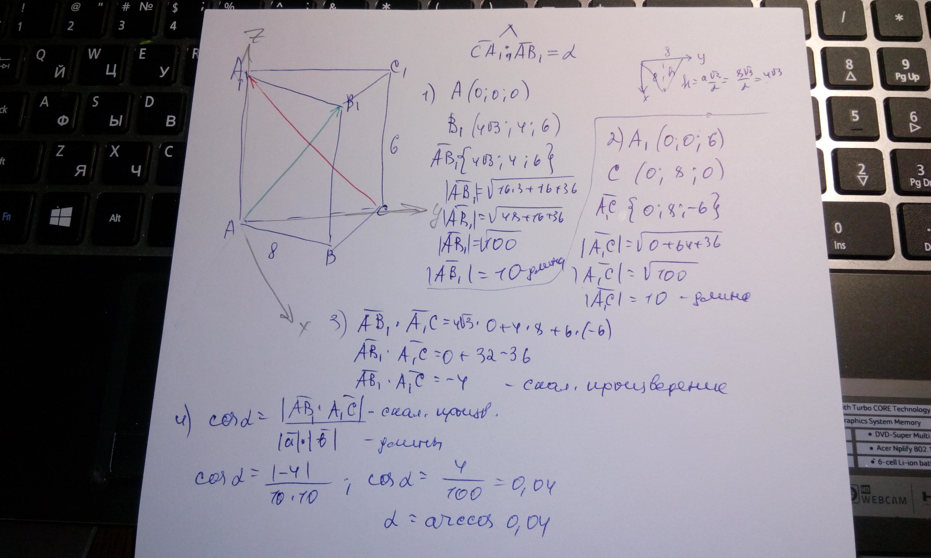 Сторона основания правильной треугольной призмы ABCA1B1C1 равна 8. Высота этой призмы равна 6. Найти угол между прямыми CA1 и AB1.