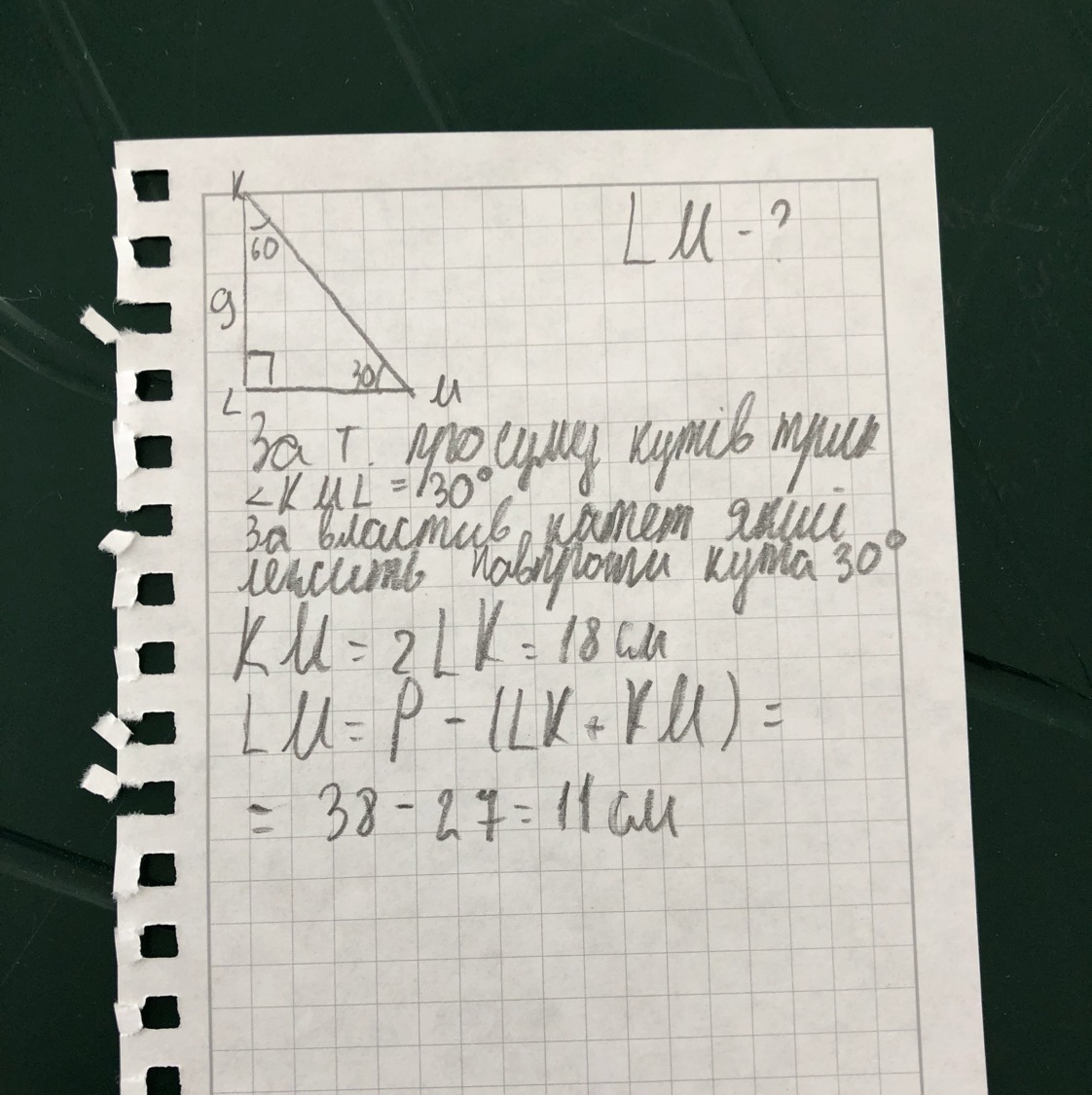 В прямоугольном треугольнике KLM угол L прямой, а угла K равен 60 градусов .Известно, что периметр треугольника равен 38 см, а LK=9 cм найдите длину LM