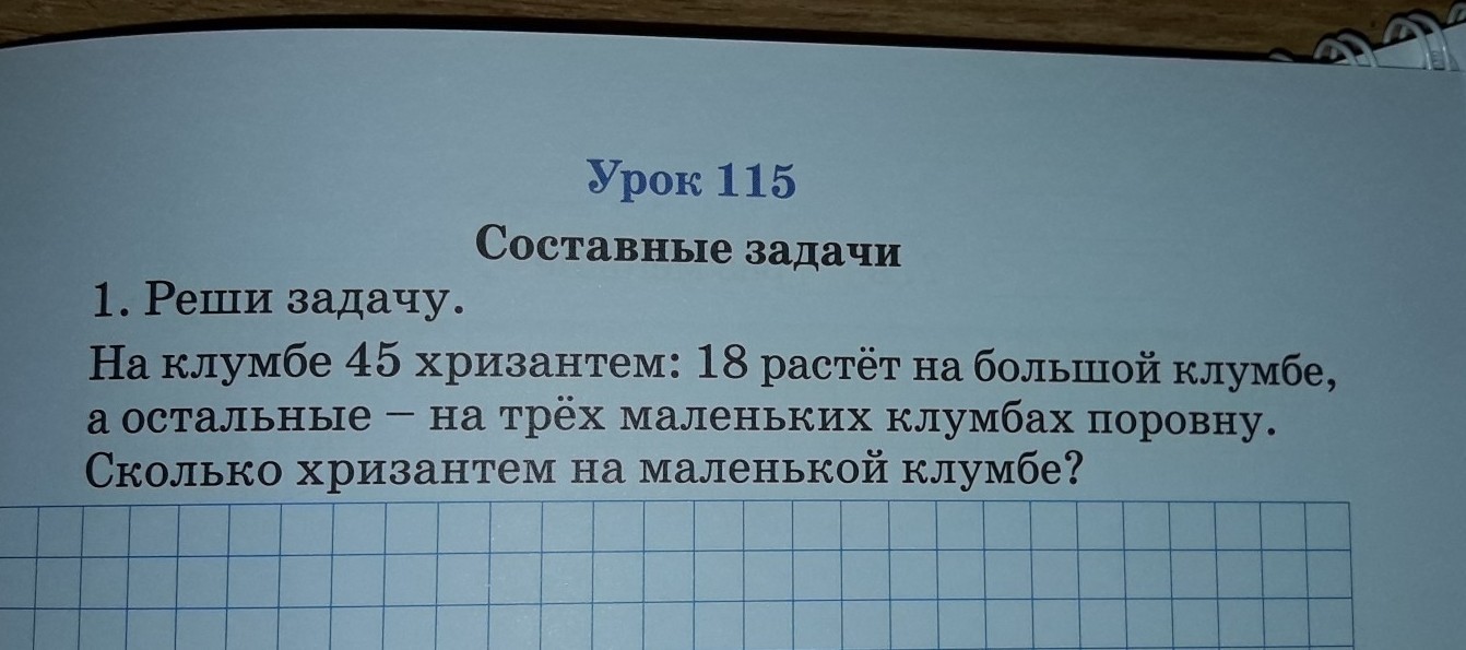 на клумбе 45 хризантем. 18 растет на Большой клумбе, а остальные -на 3 маленьких клумбах поровну? сколько хризантем на маленькой клумбе. желательно условие задачи