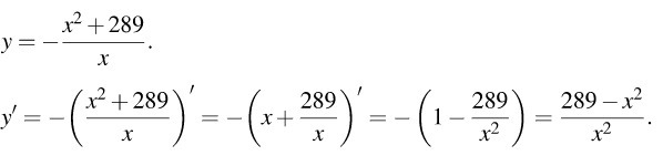 y'(x)=[(-1)*(x+frac{289}{x})]'=(-1)*[x+frac{289}{x}]'=\\ 1) [u+v]'=u'+v'\\