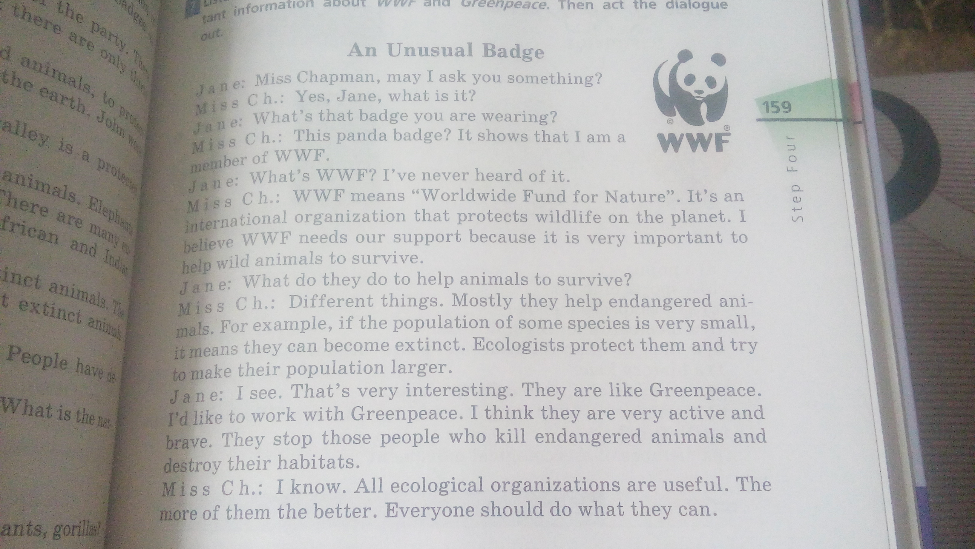 Мисс Чапман: ВФДП означает "Всемирный Фонд Дикой Природы". Это международная организация, которая защищает дикую природу нашей планеты. Я считаю, что ВФДП требуется наша поддержка, потому что очень важно помогать диким животным выживать.