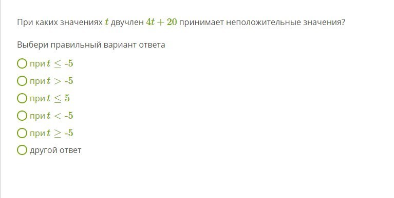 При каких значениях t двучлен 4t+20 принимает неположительные значения?