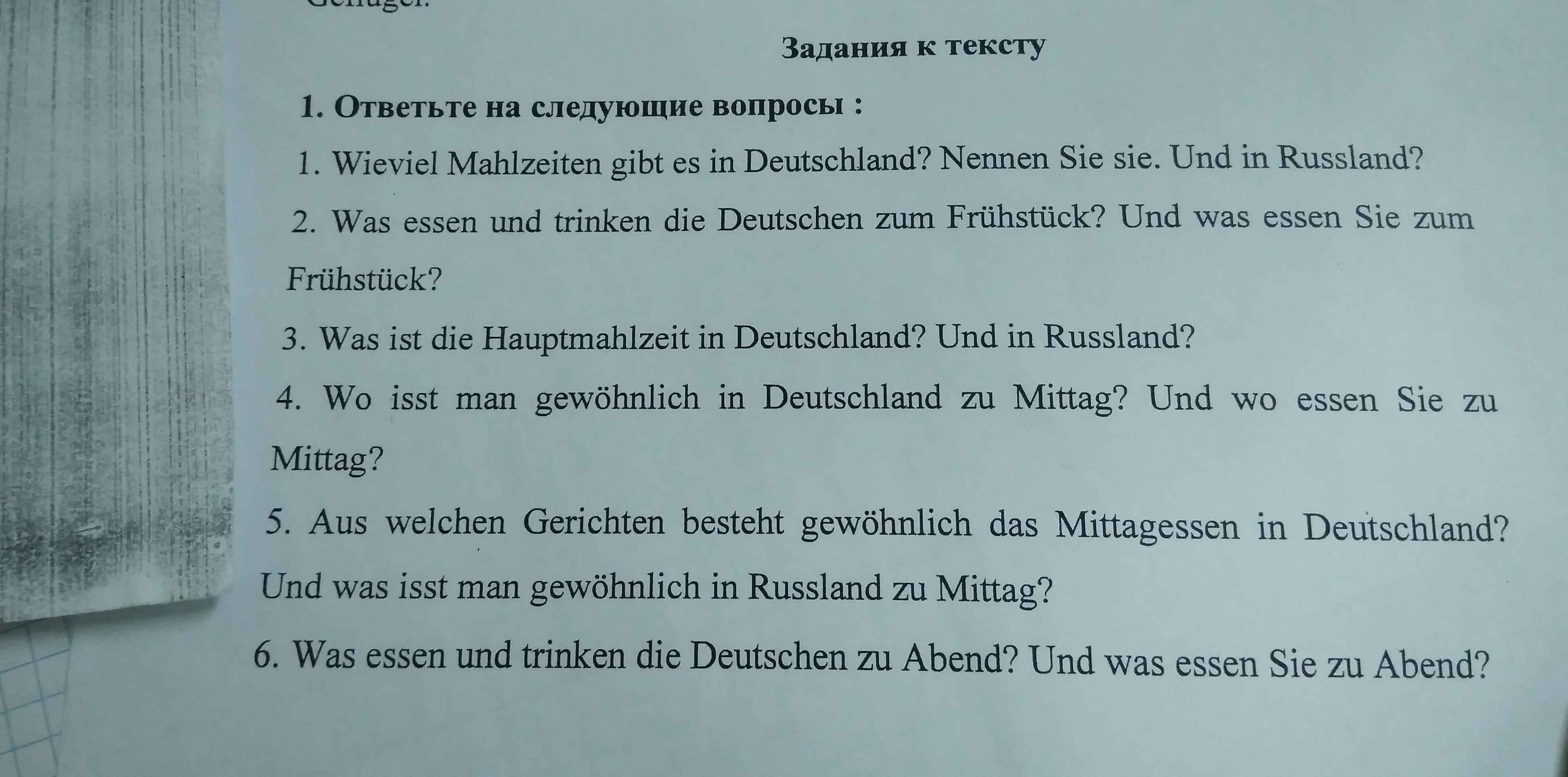 1) Es gibt vier Mahlzeiten : das Frühstück, das Mittagessen, eine Zwischenmahlzeit und das Abendessen. Und in Russland gibt es genauso vier Mahlzeiten;