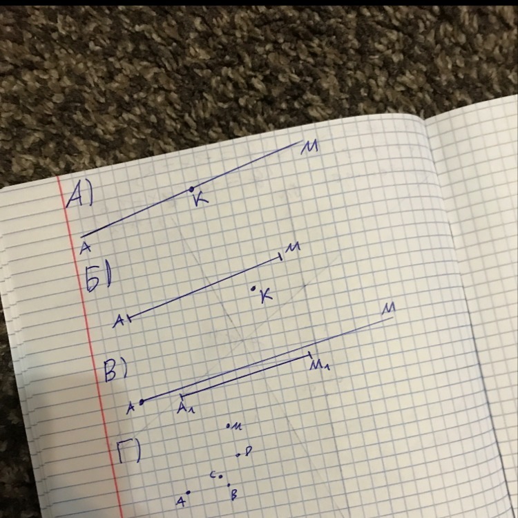 Построте и обозначьте:А)прямую и точку принадлежащую ей Б)отрезок и точку не принадлежащую ему В)полупрямую и параллельный ей отрезок Г)пять точек каждые три из которых неколлинеарные