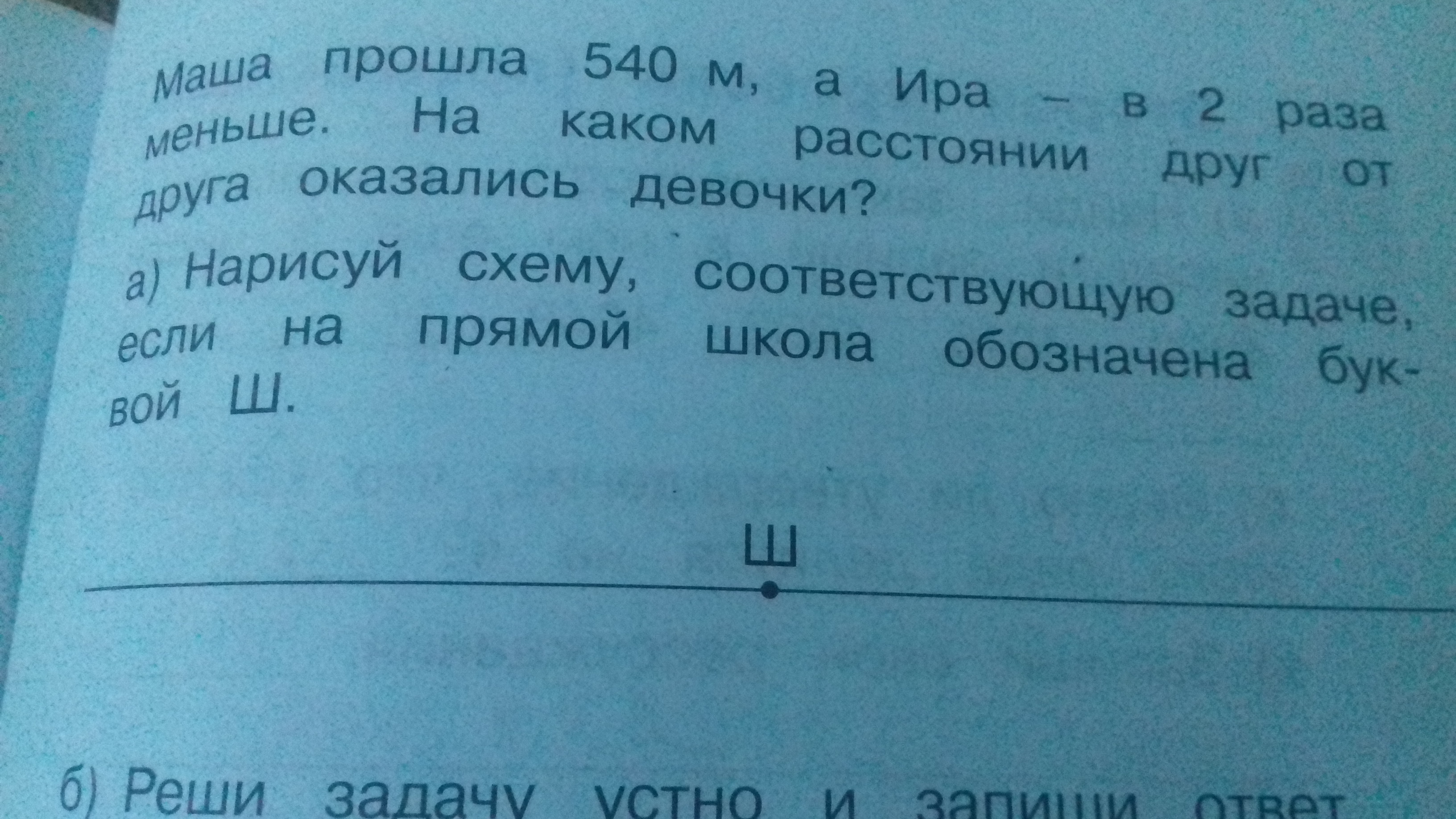 Маша и Ира одновременно вышли из школы в противоположных направлениях.Маша прошла 540м,а Ира в 2 раза меньше.На каком расстоянии друг от друга оказались девочки? Нарисуй схему соответствующую задаче, если на прямой школа обозначена буквой Ш