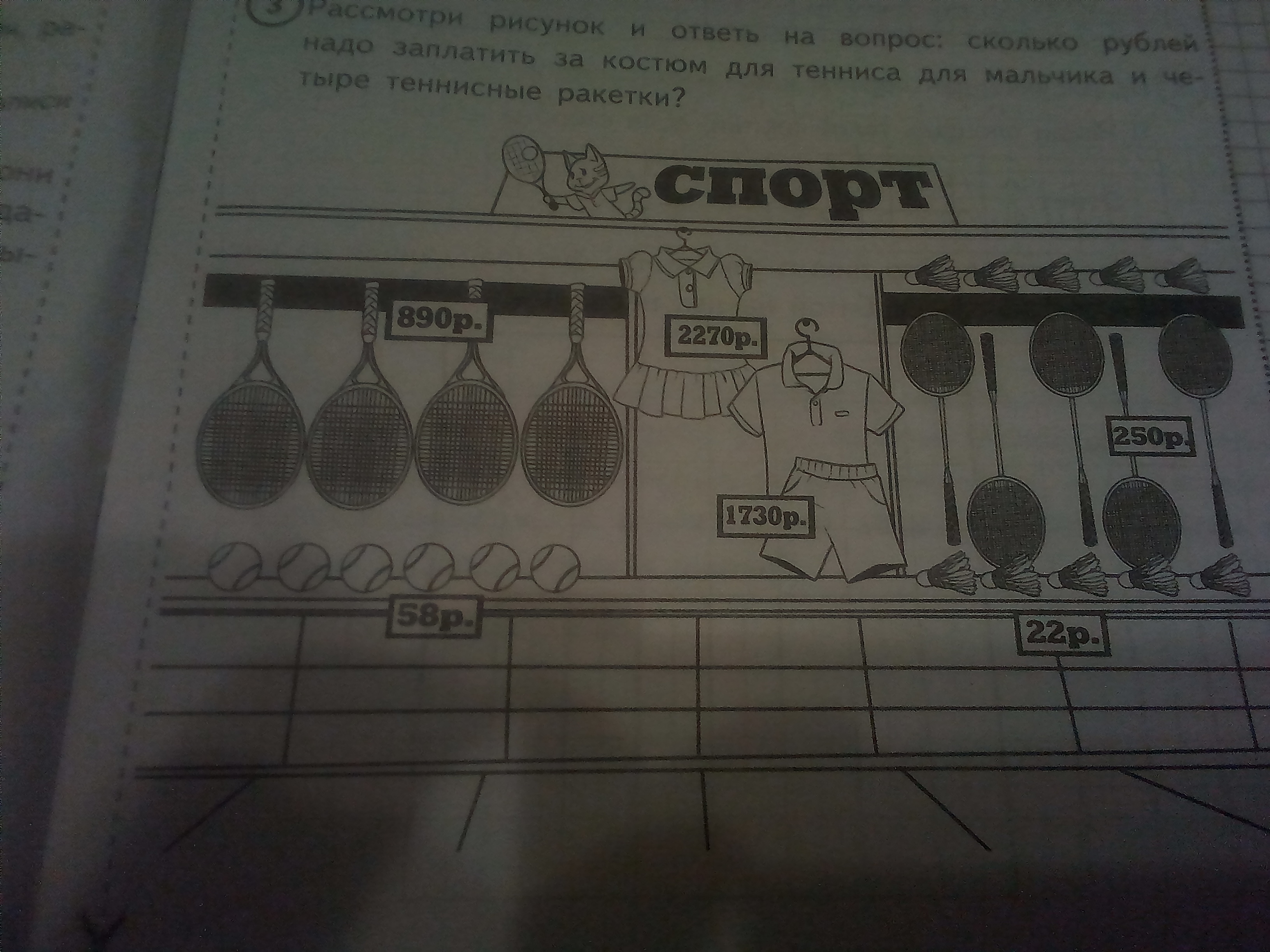 Рассмотри рисунок и ответь на вопрос Сколько рублей надо заплатить за костюм для тенниса для мальчика и 4 теннисные ракетки Решите пожалуйста
