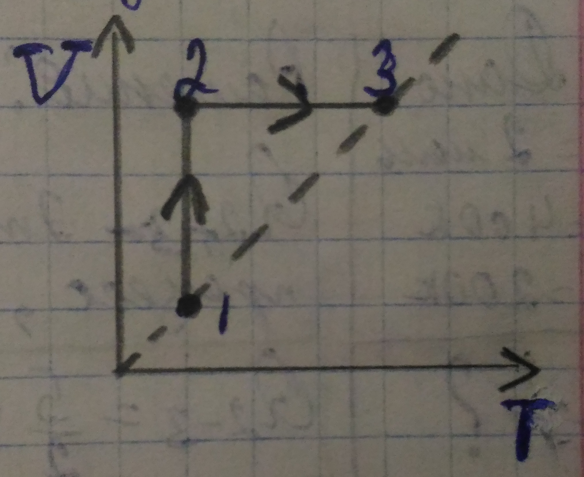 Идеальный двухатомный газ в количестве 1 моль сначала изотермически расширился (T1=300 К). Затем газ нагрели, повысив давление в 3 раза. Чему равна работа за весь процесс? Представьте график процесса в координатах P-V.