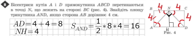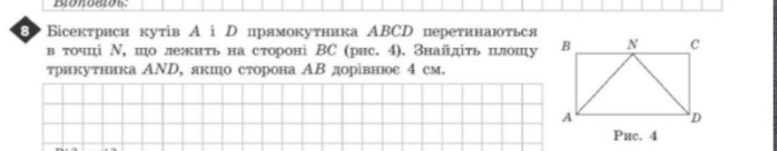 Рассмотрим треуг. ABN: ABM = 90, BAN = 45 ⇒ BNA = 45 ⇒ ΔABN - равнобедренный. AB = BN = 4; найдём AN по теореме Пифагора: 4²+4²=√32. У ΔBNC будет всё так же, BN = √32. (это можно доказать ещё раз, ну или то, что биссектрисы равны в прямоугольнике)