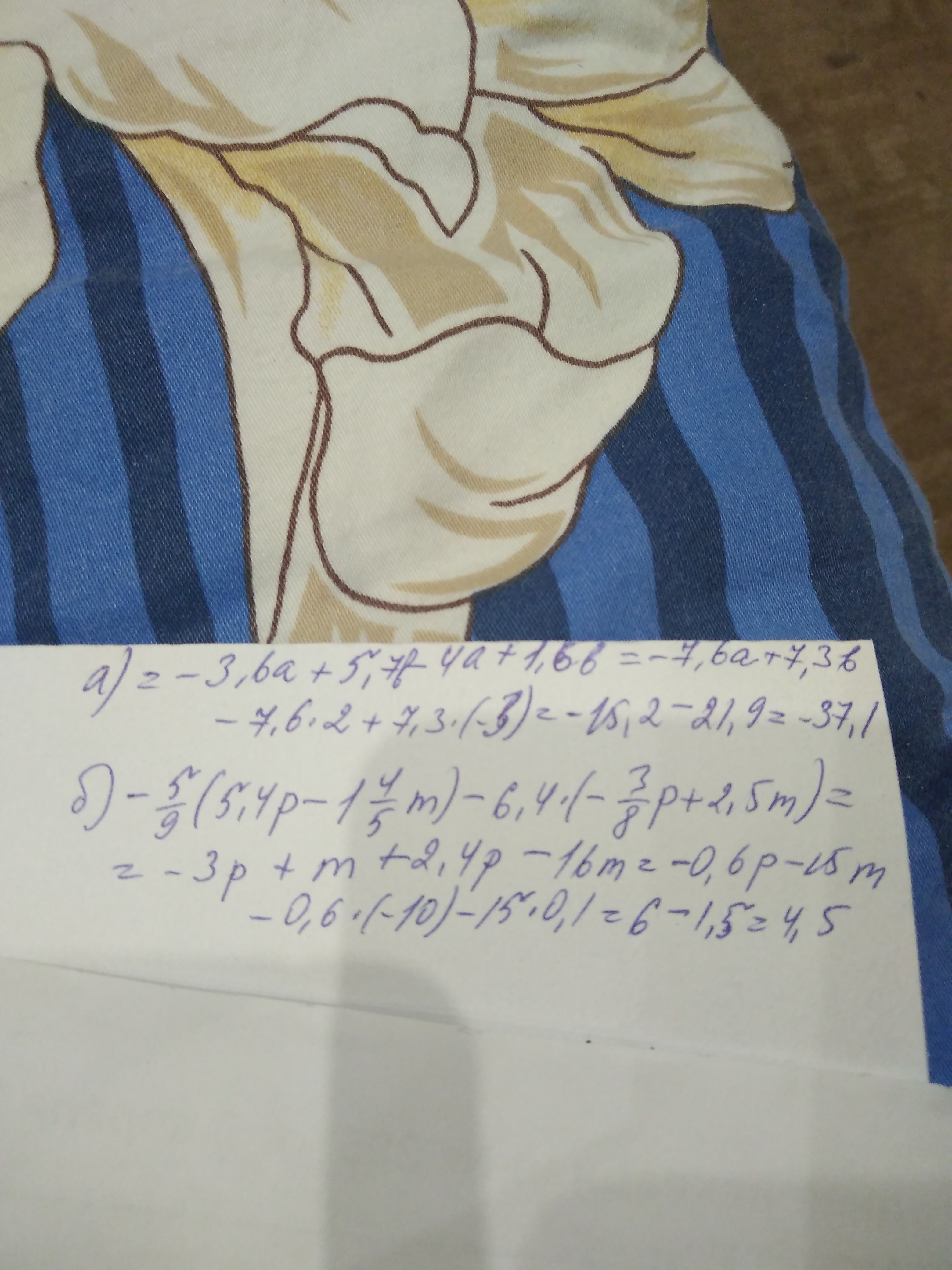 b) (дріб) -п`ять дев`ятих(5.4p-одна ціла чотири п`ятих m) - 6.4(-три восьмих p + 2.5m) якщо p = -10, m = 0.1