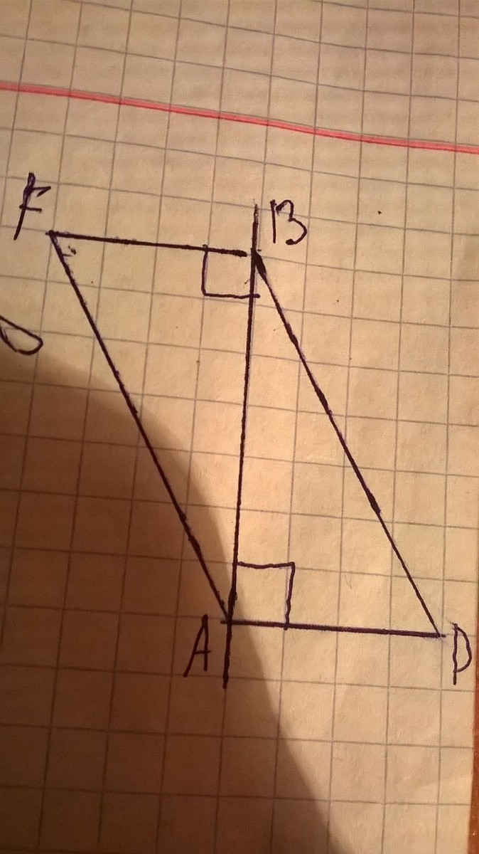 Рассмотрим ΔABD и ΔBAF. Они прямоугольные по условию, т.к. DA⊥AB, FB⊥AB. Треугольники равны по гипотенузе и катету. Действительно, катет AB общий, гипотенузы AF и BD равны по условию. Равенство треугольников доказано по признаку равенства прямоугольных треугольников.