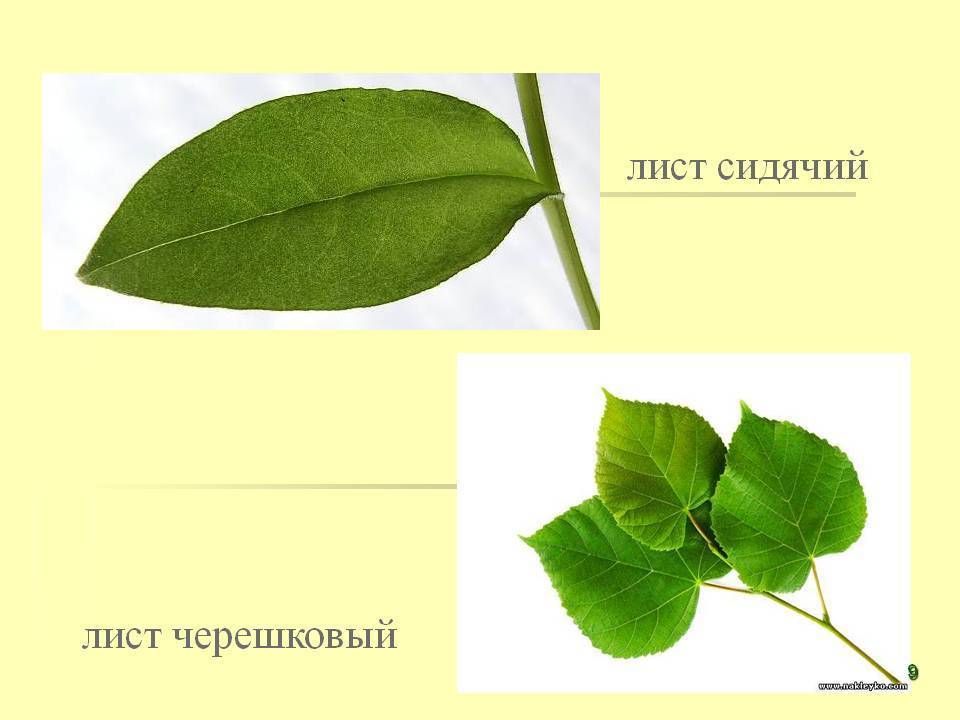у черешкового листка,есть черешок,а у сидячего нету и он прикрепляется именно листом.