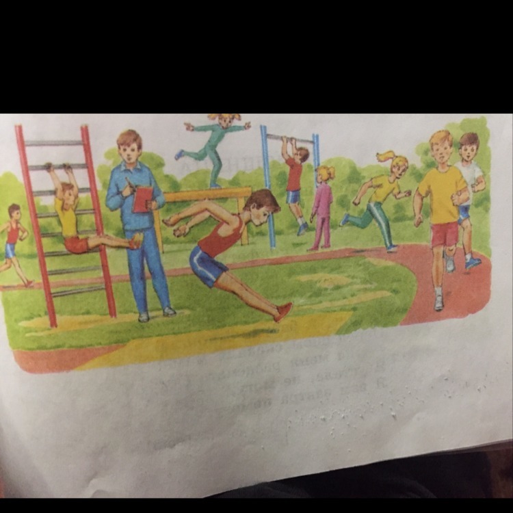 Тренер стоит по середине школьного стадиона и держит блокнот, в который он записывает результат учеников. В глаза бросается мальчик, который прыгает в длину. Рядом с тренером подтягивается девочка. Сзади тренера ещё одна девочка, но уже тренирует своё равновесие. Рядом с ней, мальчик, который подтягивается на турнике, а рядом смотрит девочка. Бегают мальчики и девочка. Вот такие вот весёлые соревнования.