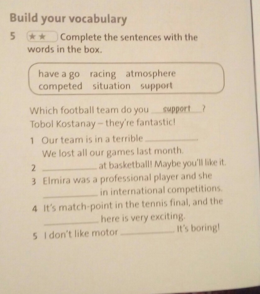 1.situation 2. Have a go 3. Competed 4. Atmosphere 5. Racing