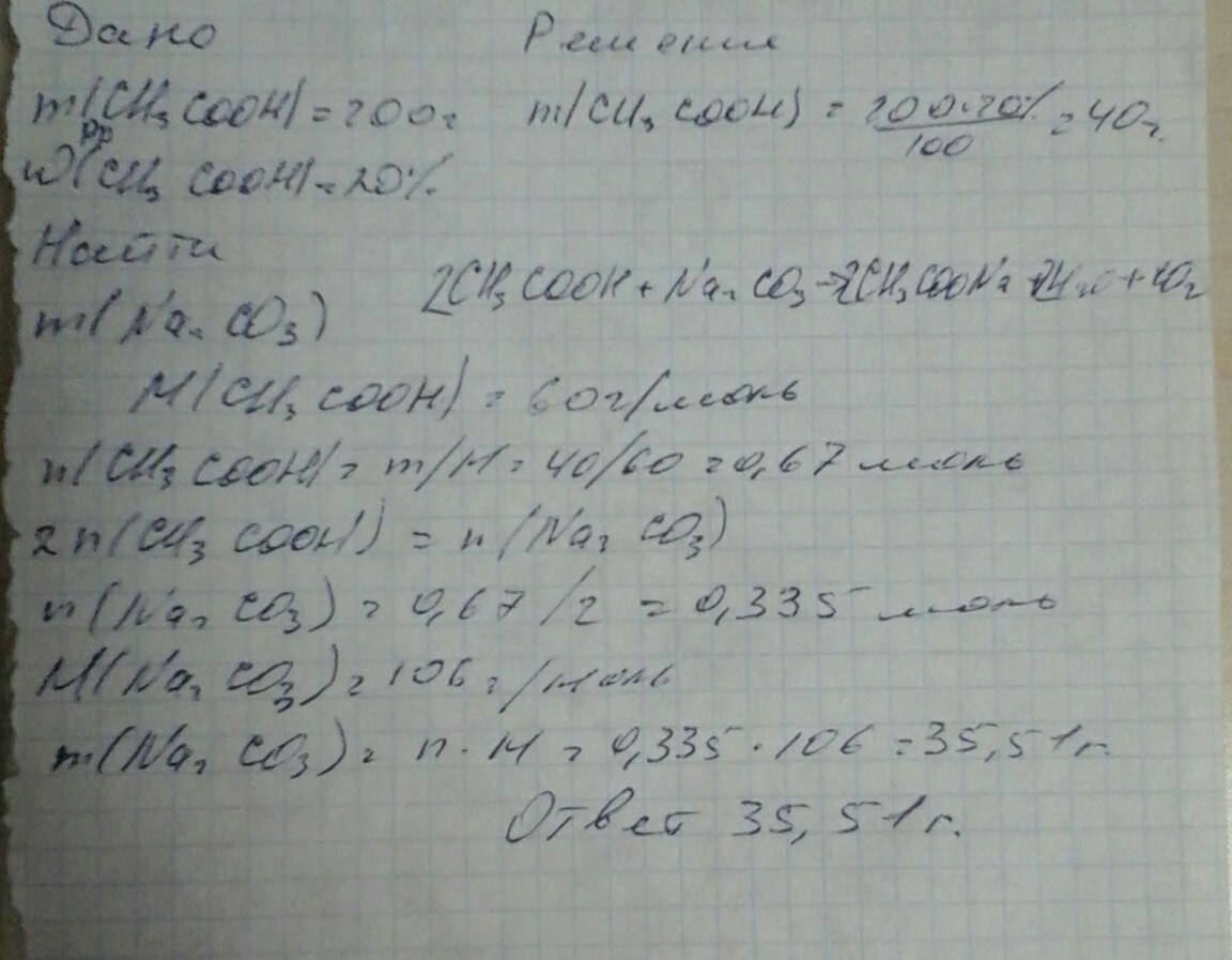 Вычислите массу карбоната натрия необходимого для реакции с раствором уксусной кислоты массой 200г и массовой долей кислоты 20%