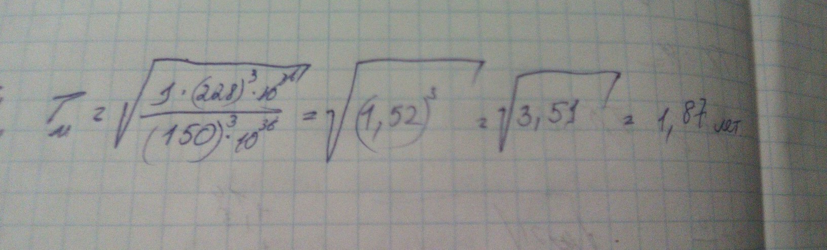 Планета Марс находится от солнца на расстоянии, равном примерно 228 * 10^6 км, а Земля на расстоянии равном примерно 150 * 10^6 км. За какое время Марс совершает полный оборот вокруг солнца?
