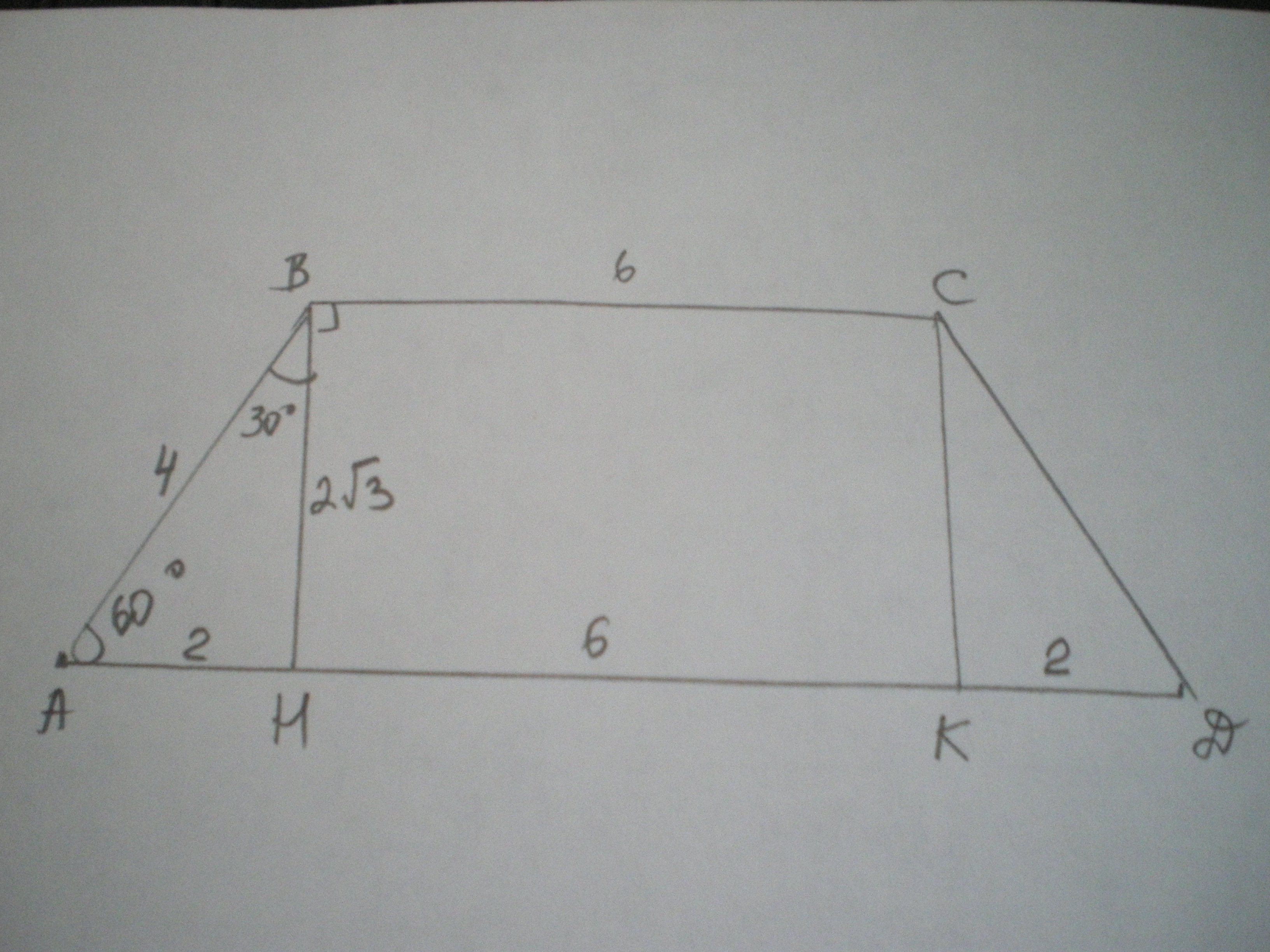 S=(АД+ВС):2*ВН=(АН+КН+КД+ВС):2*2√3=(10+6):2*2√3=16√3 см²