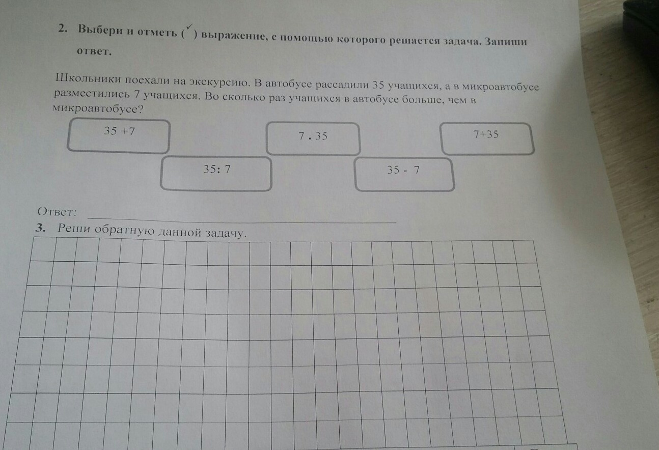 Школьники поехали на экскурсию, в автобус посадили в 5 раз больше учащихся, чем в микроавтобус. В микроавтобус 7 учащихся. Сколько в автобусе учащихся? Задача обратная данной)