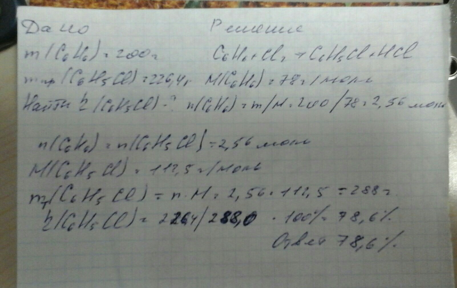Из 200г. Бензола было ролучено 226.4г. Хлорбензола. Найдите выход продукта реакции (в%) от теоретического