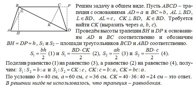 Основания AD и ВС равнобокой трапеции АВСD равны соответственно 60см и 40см. Расстояние от точки А к диагонали BD составляет 36 см.