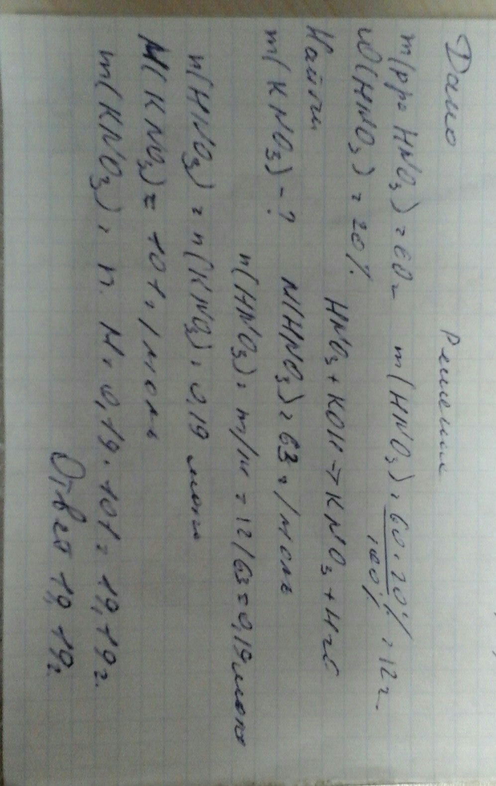 к 60г 20% раствора азотной кислоты добавили избыток раствора гидроксида калия. Определите массу образующийся соли