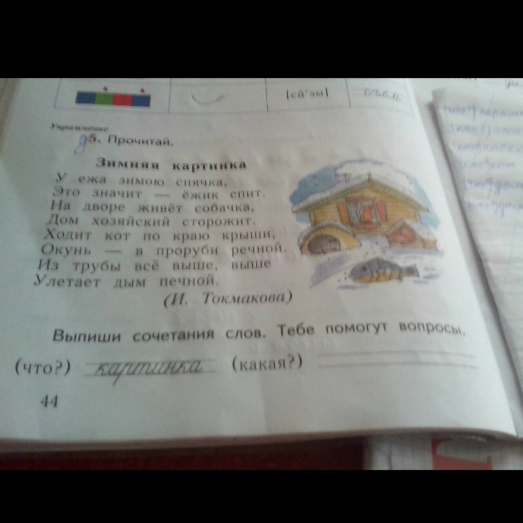 картинка (какая ?) зимняя, (что?) дом (какой?) хозяйский, (что?) дым (какой?) печной.