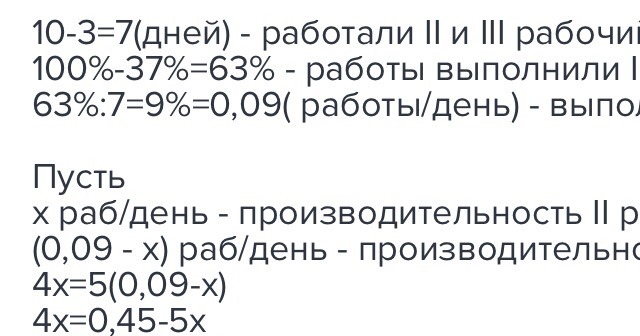 Трое рабочих выполнили работу за 10 дней, причем первый работал только 1 день и за день было выполнено 19% всего задания. За сколько дней выполнил бы всю работу каждый рабочий, если известно, что второй за 4 дня делает столько, сколько третий за 5 дней?