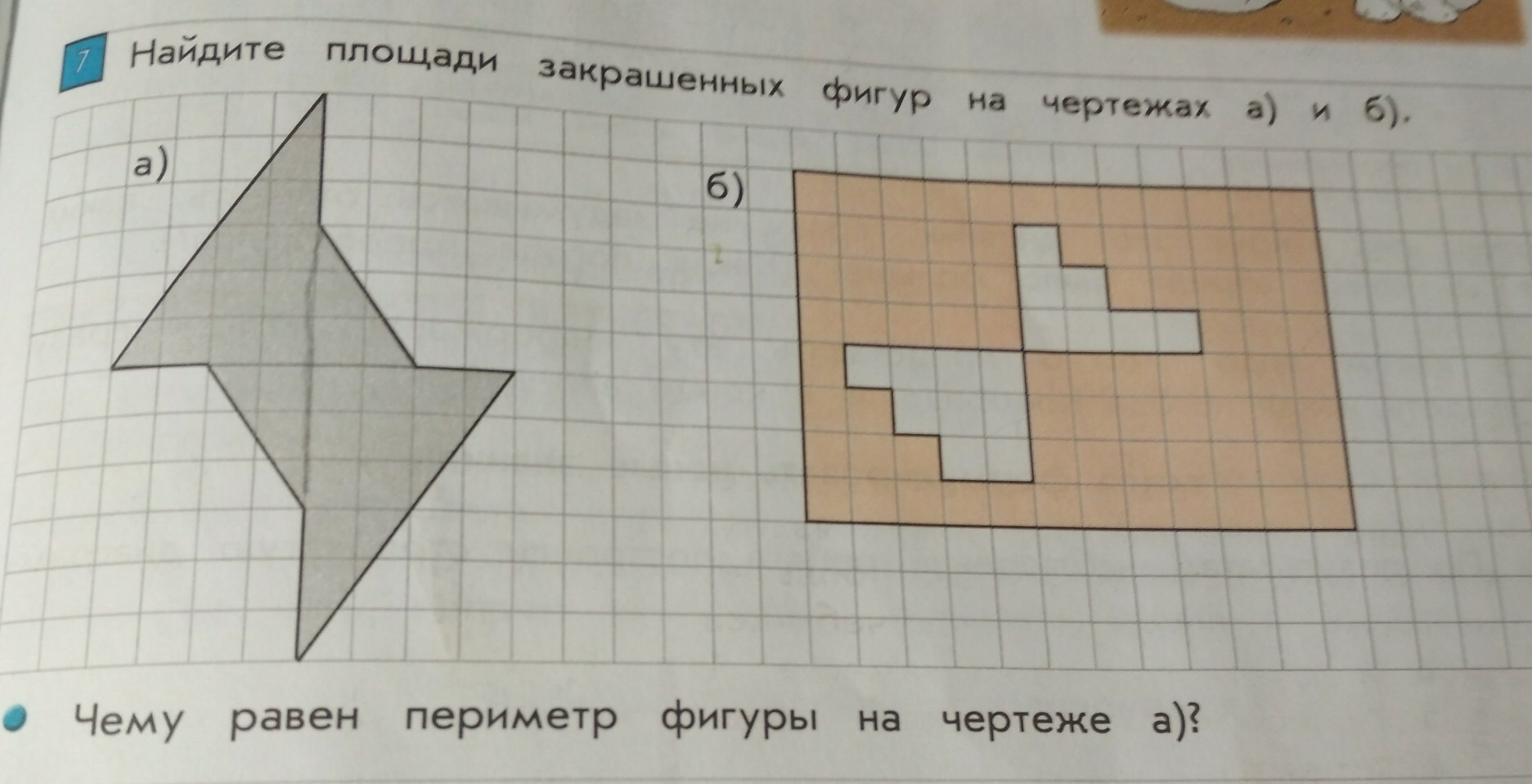 Найди площади закрашенных фигур._Чему равен периметр фигуру на чертеже (а)?