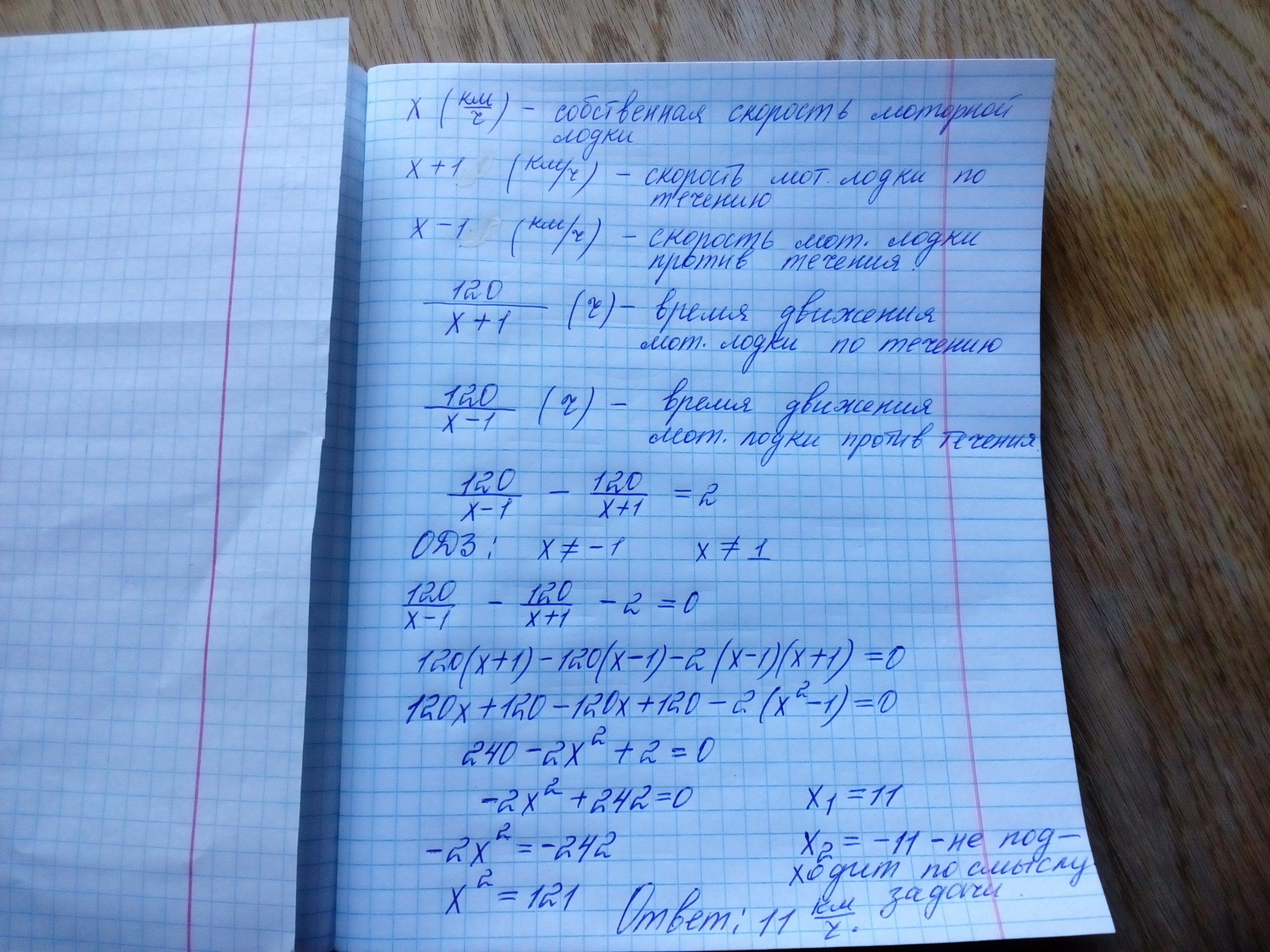 Моторная лодка прошла против течения реки 120км и вернулась в пункт отправления, затратив на обратный путь на 2 часа меньше.Найдите скорость лодки в неподвижной воде если скорость течения ровна 1 км/ч