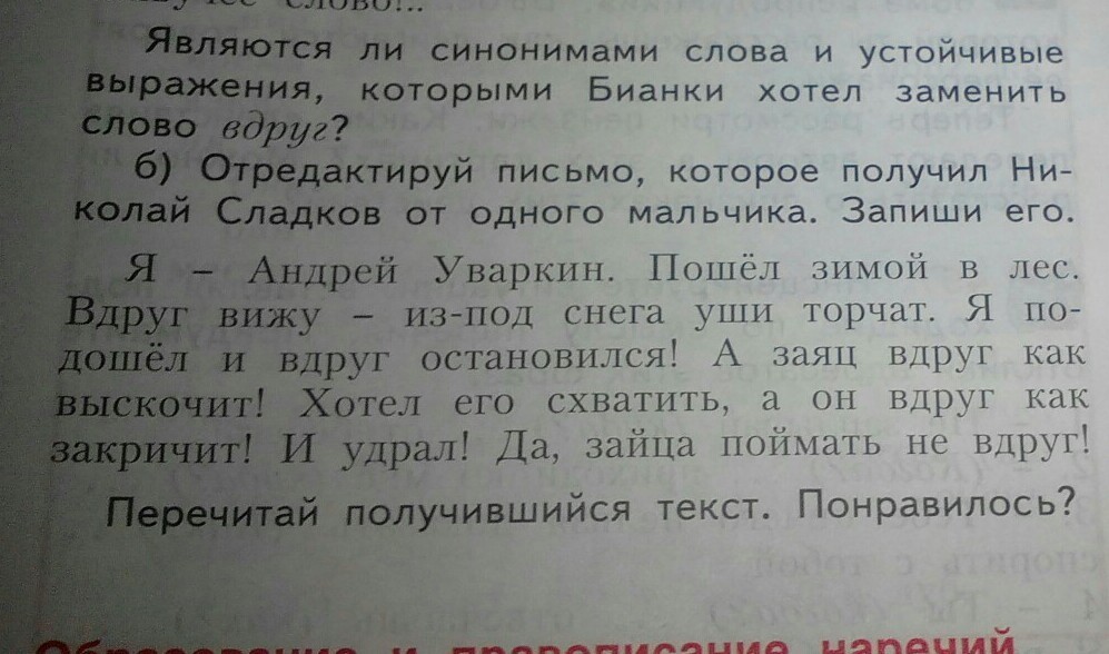 Меня зовут Андрей Уваркин . однажды я пошел в зимний лес. Иду , и вдруг вижу - из- под снега уши торчат . я подошёл и распознал зайца , я аккуратно подошёл и вдруг заяц выскочил. я хотел его схватить, но он закричал и удрал . да , зайца не поймать