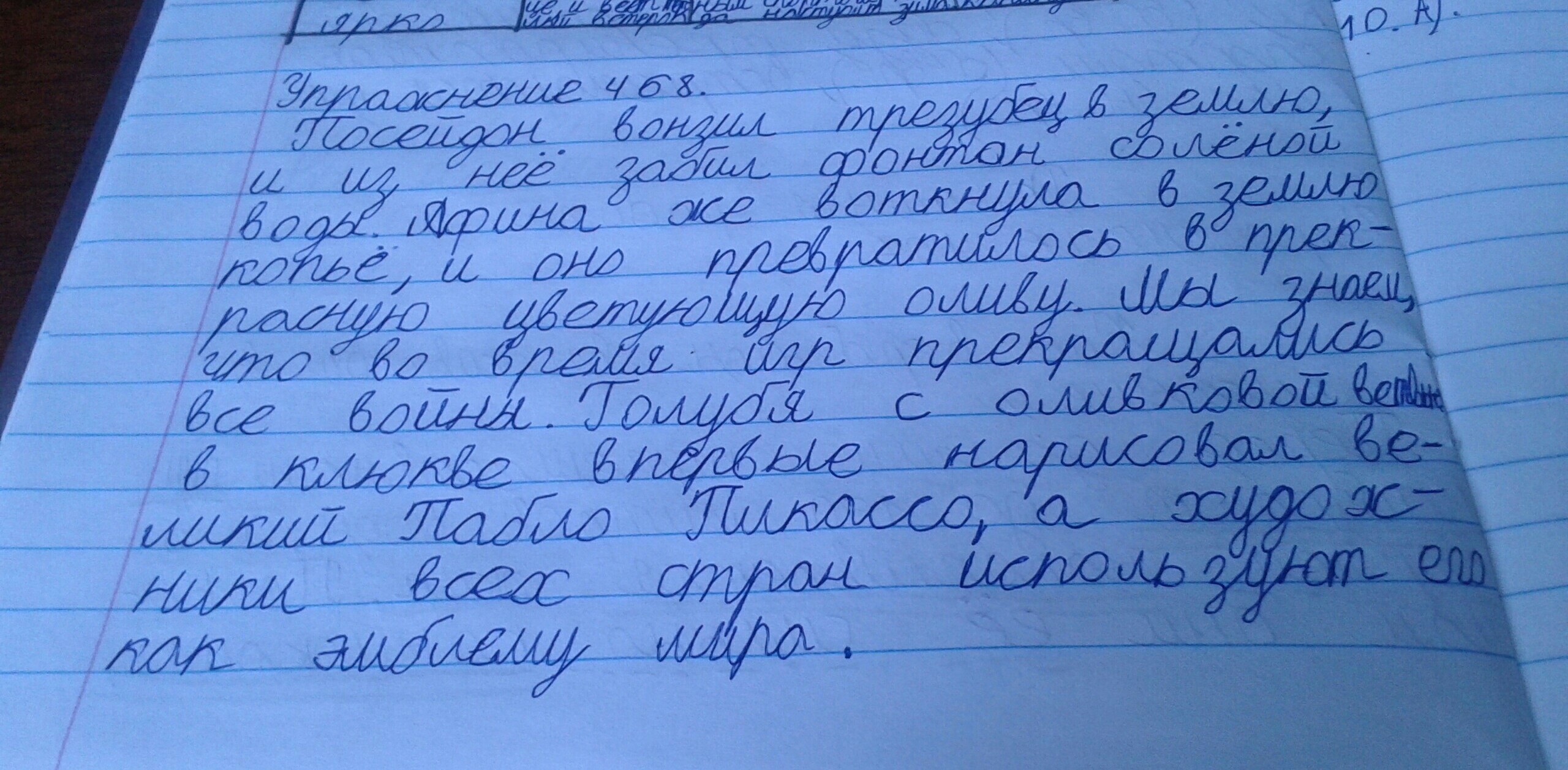 1. Посейдон забил трезубец в землю, и из неё забил фонтан солёной воды. 2.Афина же воткнула в землю копьё, и оно превратилось в прекрасную цветущую оливу.3.Мы знаем, что во время игр прекращались все войны.4. Голубя с оливковой веткой в клюве впервые нарисовал великий Пабло Пикассо, а художники всех стран используют его как эмблему мира.