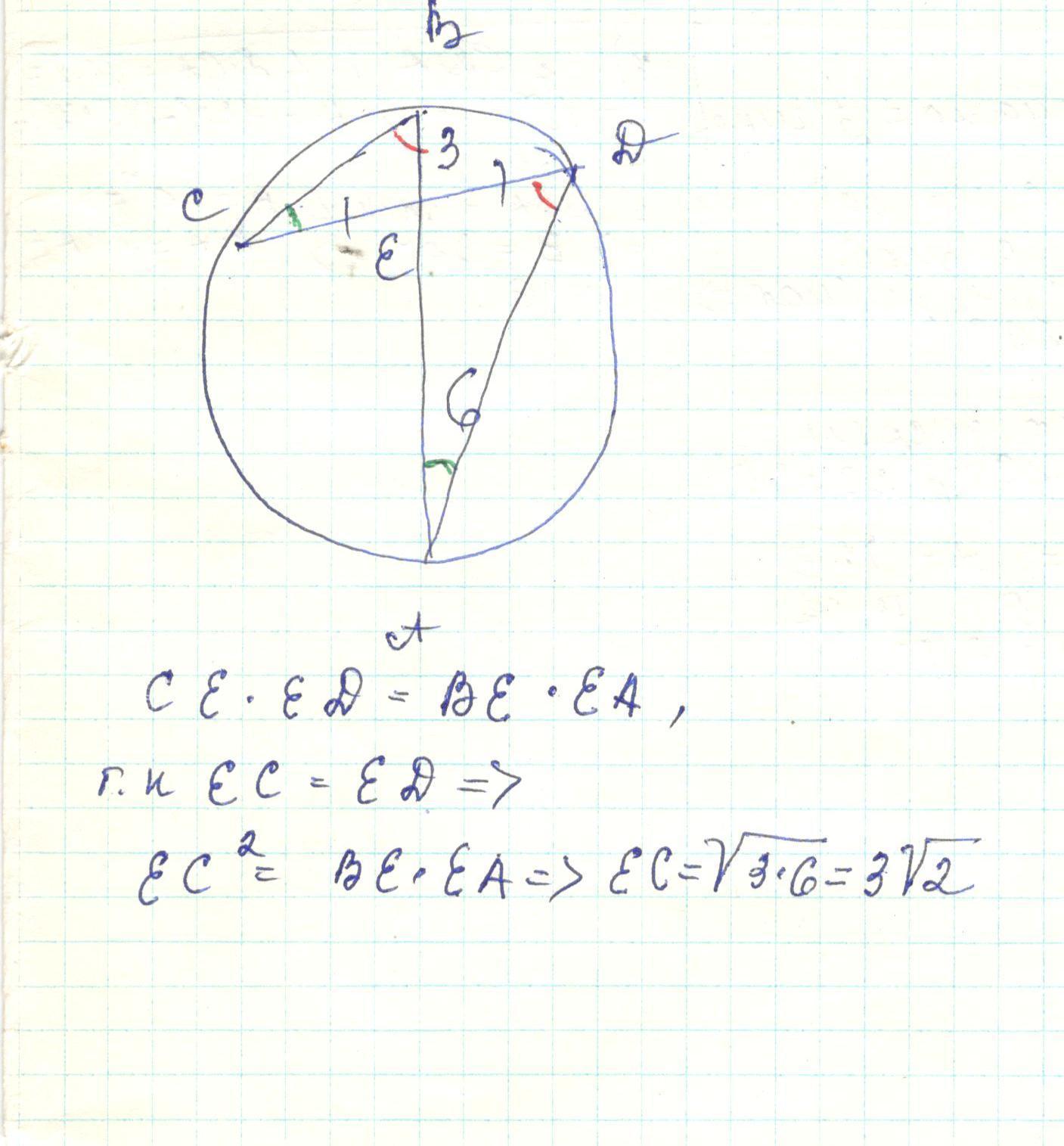 Дано пересечение хорд ab и cd в точке E AE=6; EB=3; CE=ED найдите CE. НАЧЕРТИТЬ РИСУНОК ОБЯЗАТЕЛЬНО!!!!