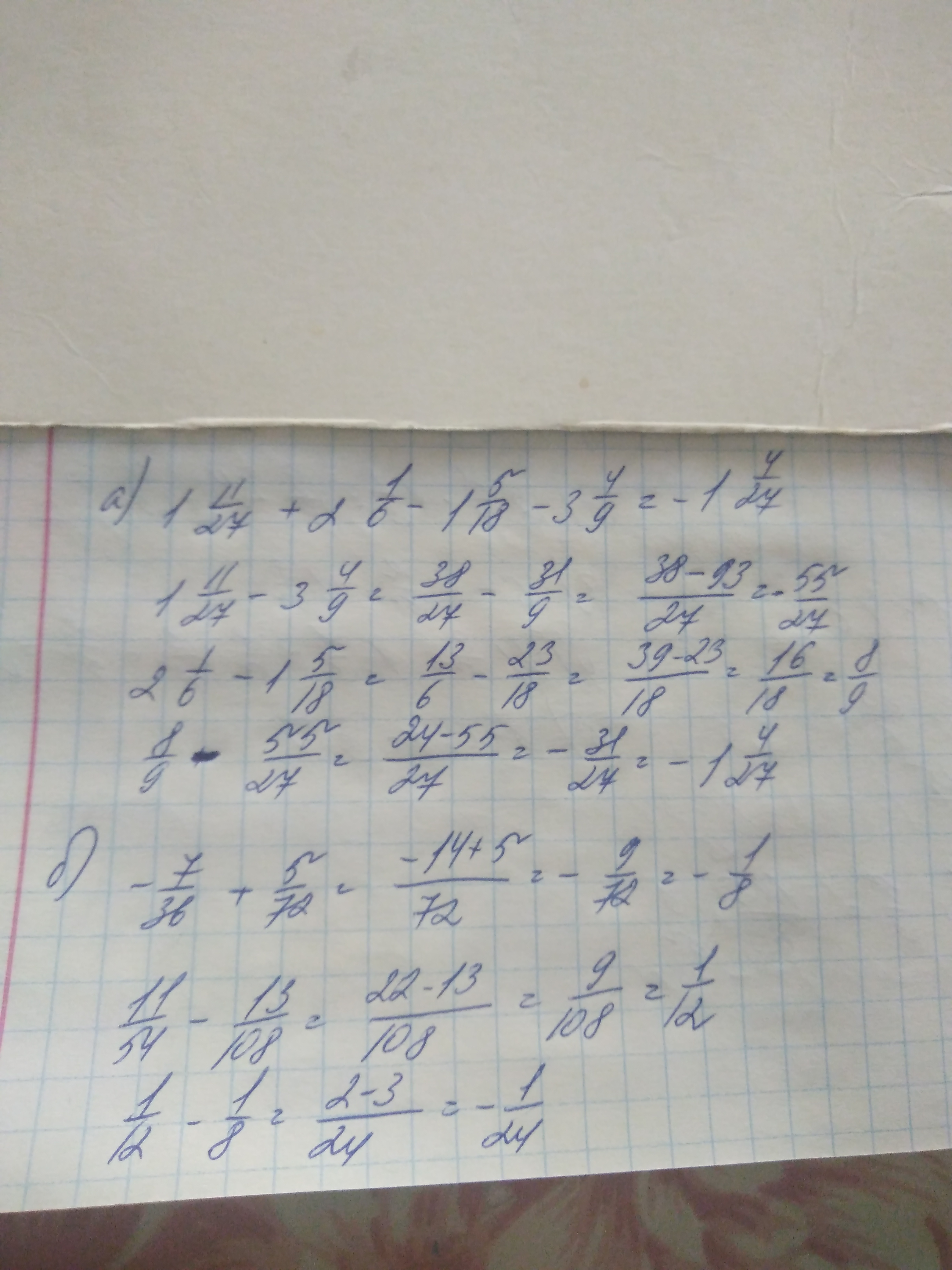 а) 1 11/27 + 2 1/6 + ( -1 5/18)+( -3 4/9)