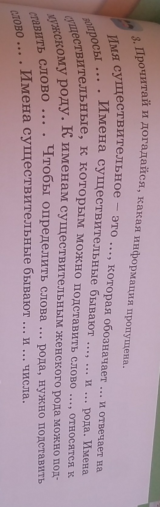 Имя существительное-это часть речи, которая обозначает предмет и отвечает на вопросы кто? и что?.Имена существительные бывают женского, среднего и мужского рода.Имена существительные , которым можно подставить слово он мой, относятся к мужскому роду.К именам существительным женского рода можно подставить слово она моя.Чтобы определить слова среднего рода можно подставить слово оно моё.Имена существительные бывают единственного и множественного числа.
