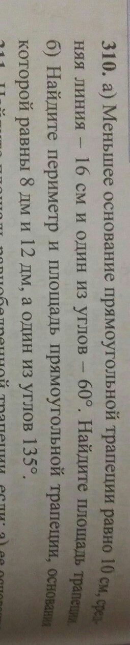 средняя линия это полусумма оснований, площадь=полусумма оснований на высоту. найди высоту и все