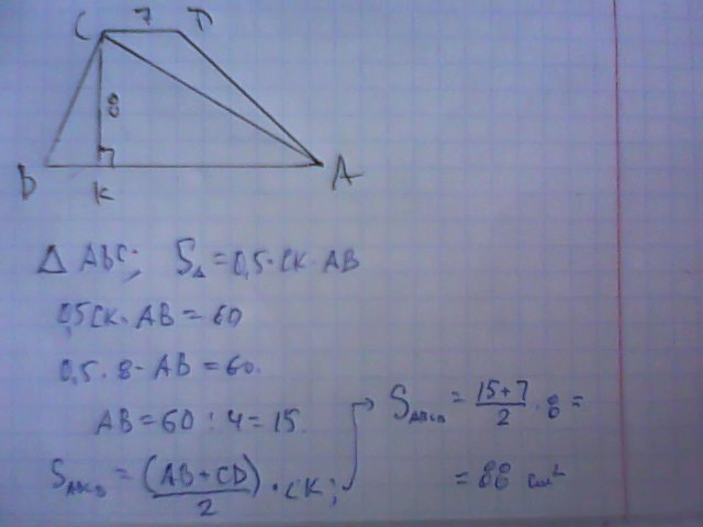 У трапеції ABCD менша основа CD і висота відповідно дорівнюють 7 і 8 смЗнайдіть площу трапеції якщо площа АВС дорівнює 60 см квадратиних