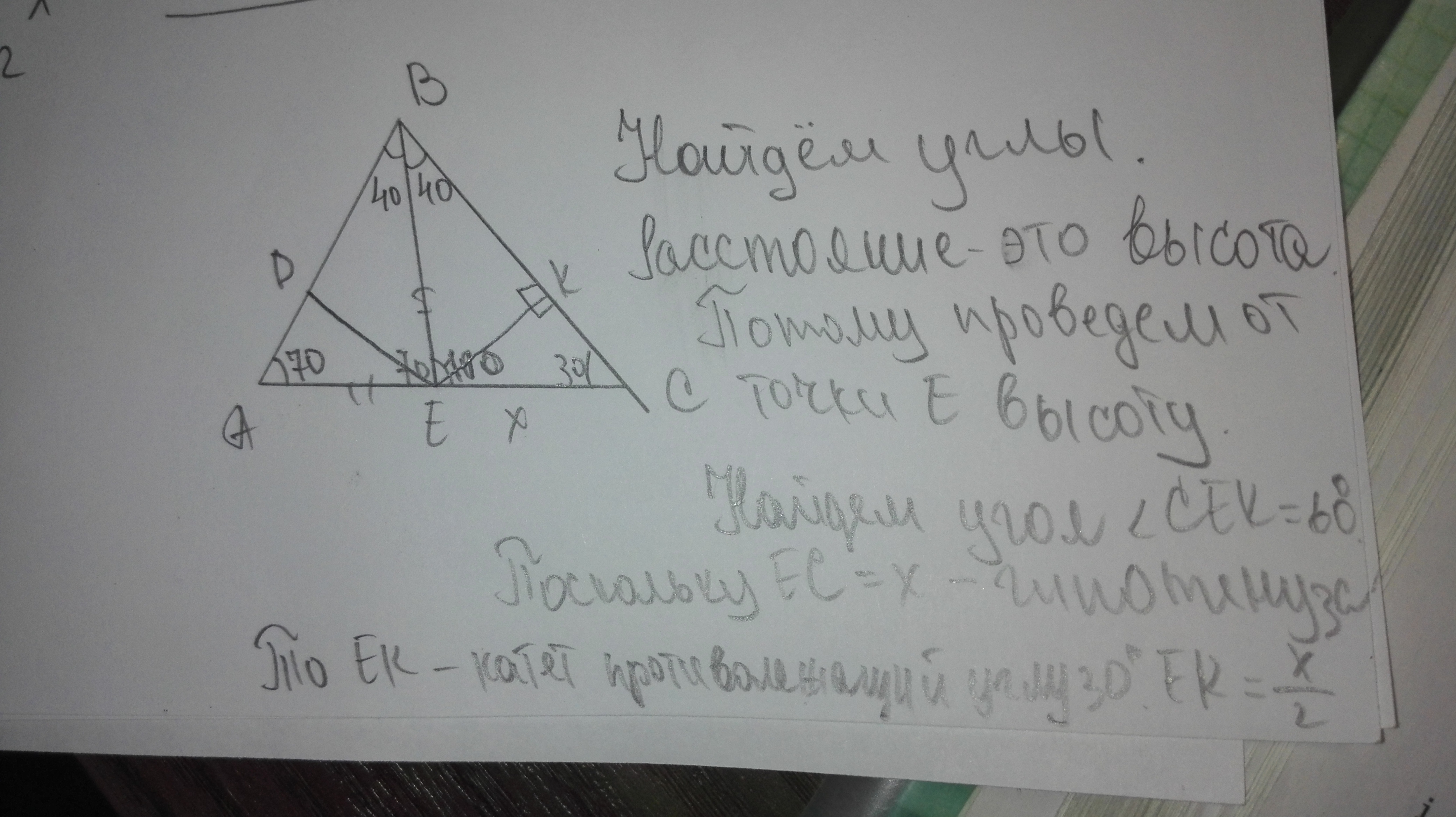 В треугольнике АВС угол А=70○ угол В=80○.BE это биссектриса через точку E проведена прямая A параллельна BC,EC=x.найдите расстояние между прямыми A и BC.НАЙДИТЕ расстояние от точки E до прямой AB.
