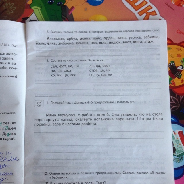 2.Апельсин,осина,уточка,забияка,ёжик,ива,юла,енот. 3.салфетница,сестрица,колесница,светлица,страница,гусеница. 1Она посмотрела на Колю и кота.Коля грустно уставился на маму и во всём признался.Мама не поругала ни его,ни кота.Она просто попросила Колю не гнаться за котом и вести себя хорошо.Коля послушался.
