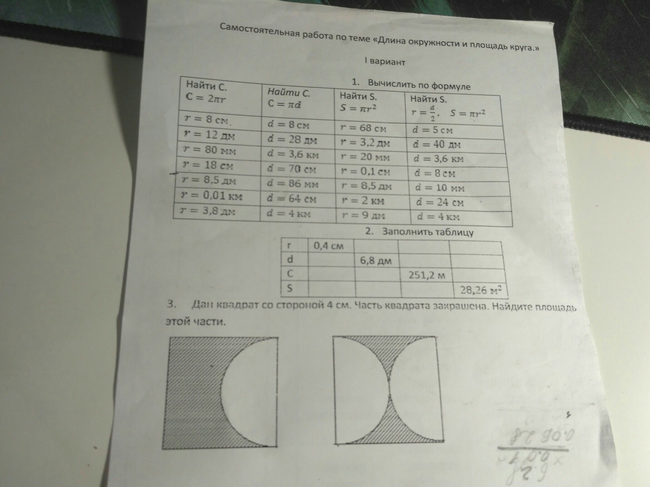 2) r=0,4 cм ; d=2r=0,8 cм ; C=2πr=0,8π cм ; S=πr²=0,16π см²