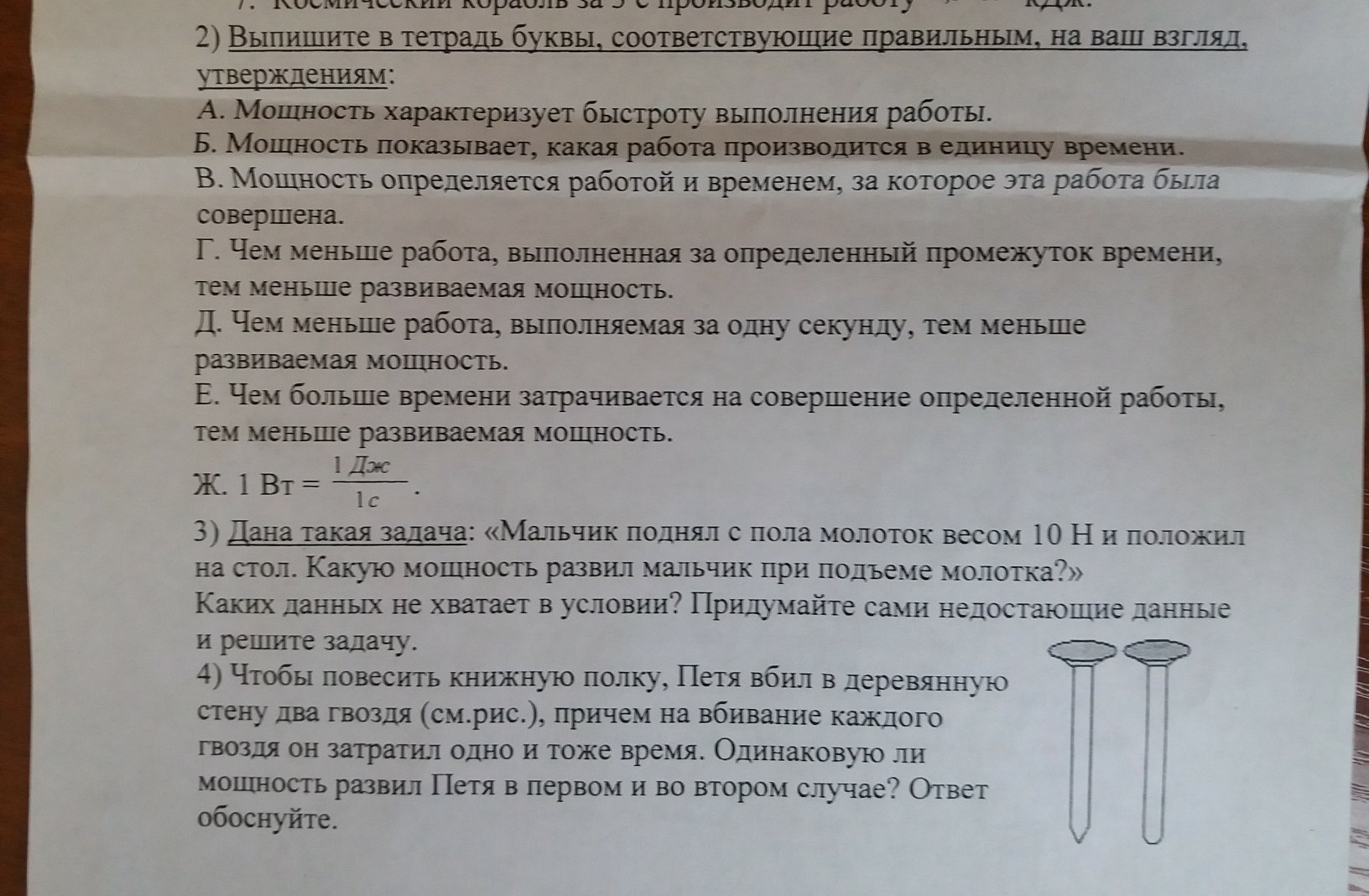 3) Не хватает времени, за которое мальчик выполнил данное действие (поднял и положил на стол молоток). Также не хватает высоты стола (расстояния, на которое был поднят молоток).