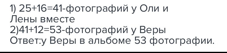 у Оли в альбоме 25 фотографий у Лены 16 а у Веры на 12 больше чем у Оли и Лены вместе Сколько фотографий в альбоме веры