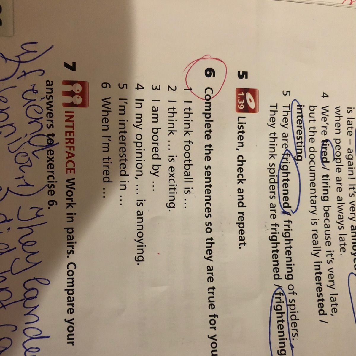 1) I think football is interesting game. 2) I think skiing is exciting. 3) I m bored by doing homework. 4) In my opinion cleaning the room is annoying. 5) I'm interested in reading fantasy books. 6) When Im tired of doing something I relax by listening music.