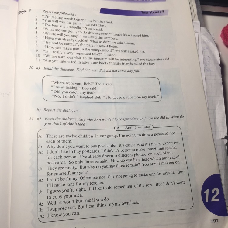 1 а) Прочтите диалог. Скажите, кому Аан хотел сориентироваться и как, что вы думаете об идее Анны? : В нашей группе двенадцать детей. Я собираюсь сделать открытку для каждого из них. I: Почему вы не хотите покупать посыльные? Это проще, и это не так дорого. Я не люблю покупать открытки. Я думаю, что лучше сделать что-то особенное для каждого человека. Я уже рисую другую картинку или каждую из десяти открыток. Осталось всего три. Как вам нравятся эти, которые готовы J: Они красивые. Но почему вы говорите, что трое остаются? Вы не делаете это для себя, не так ли? A: Не смешно! Конечно нет. Я не собираюсь делать это для себя. Но я сделаю один для своего учителя: я думаю, вы правы. Я хотел бы сделать что-нибудь подобное. Но я не хочу копировать вашу идею. A: Ну, это не повредит mme, если вы это сделаете. J: Полагаю, нет. Но я могу придумать свою идею. A: Я знаю, что вы можете.